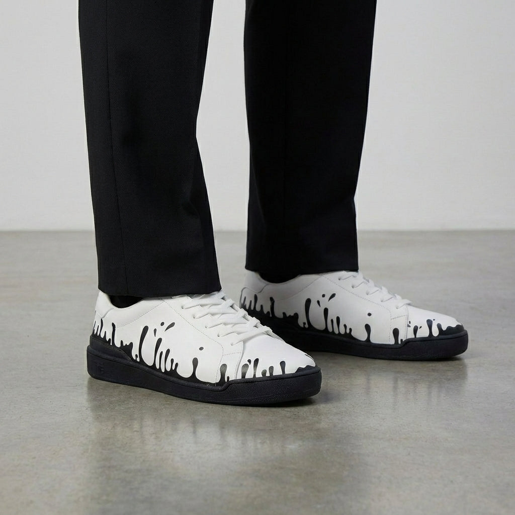 White leather low-top sneakers with black drops design.